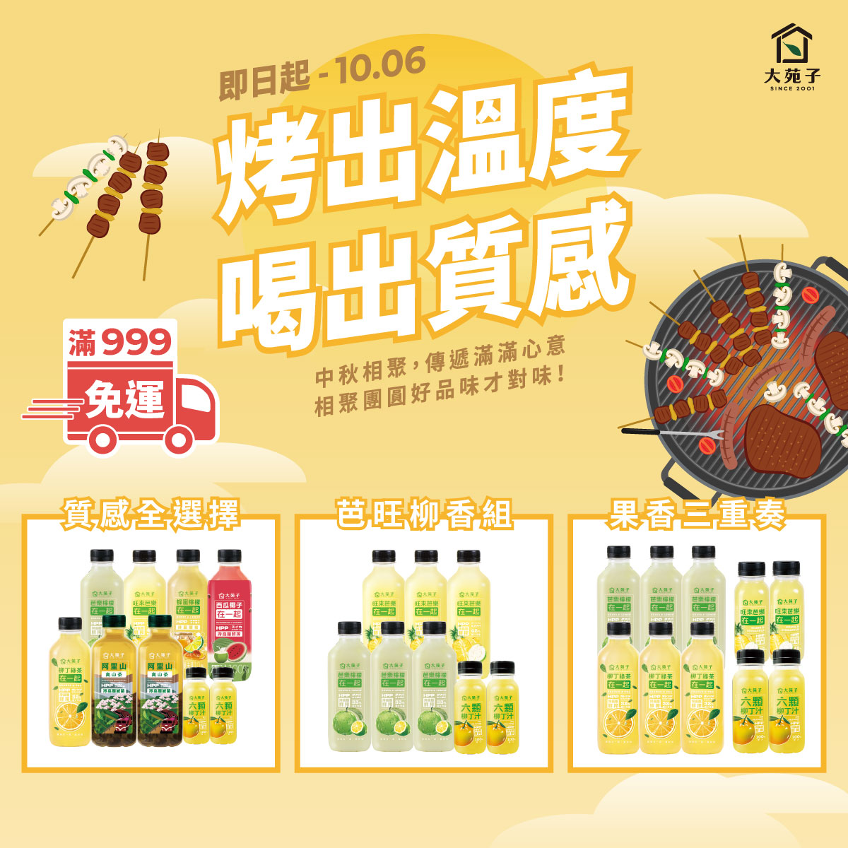 同時,大苑子鮮果商城(https://pse.is/85fwhk)也推出HPP飲品中秋限定優惠,即日起至10月6日,消費者可在官方電商平台選購多款嚴選台灣在地水果與優質茶葉的HPP飲品。HPP冷高壓保鮮技術完整保留果汁營養與風味,不添加防腐劑,安心天然。