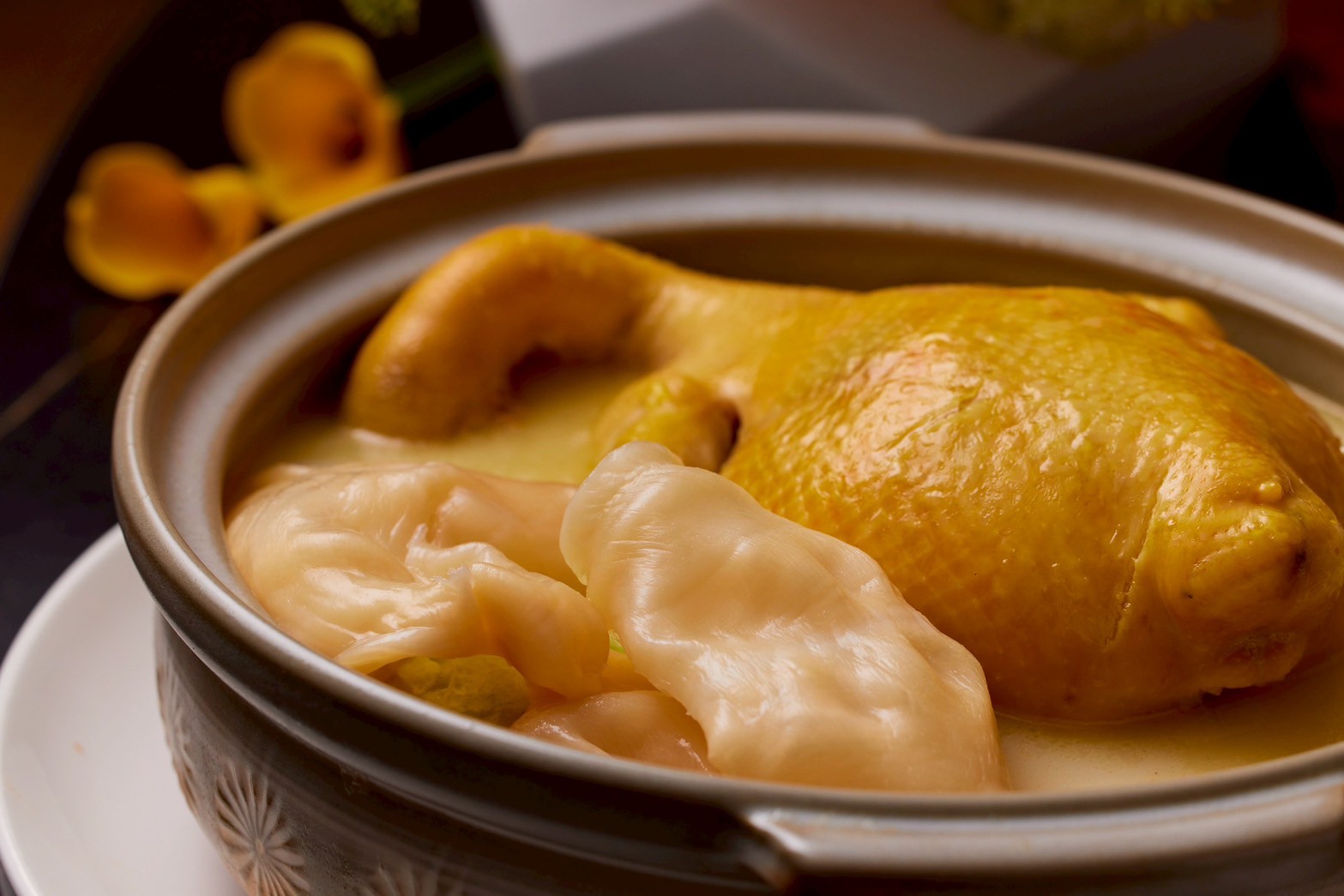 濃高湯花膠煲雞:採用老母雞慢火熬煮湯底,加入高價值的 花膠(海味四大珍品之一),湯頭濃稠滑順、膠原蛋白滿滿,不但滋補養顏,也是高球後補充能量的絕佳之選;此菜需提前預訂。