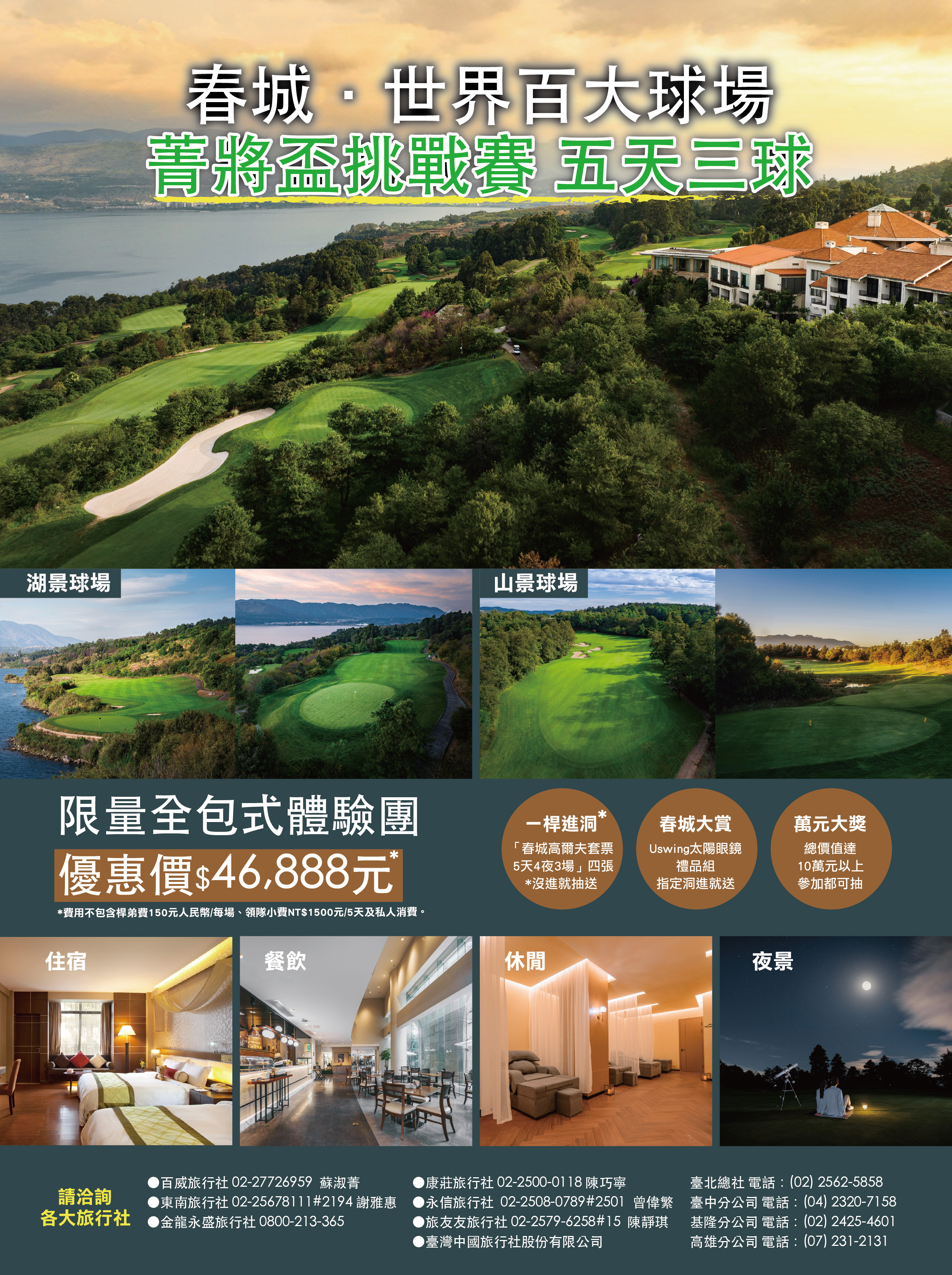 當台灣冬季逐漸轉涼濕冷,雲南昆明卻依舊四季如春,被譽為「春城」。這裡不僅氣候宜人,更擁有亞洲頂尖的高爾夫場地,其中最令人嚮往的,正是榮登世界百大球場的「春城湖景球場」。今年12月8日至12日,特別推出「春城高爾夫五日行程」,結合三場揮桿挑戰、奢華住宿、精緻美食與驚喜獎項,為台灣球友量身打造一場冬季專屬的高球盛會。
